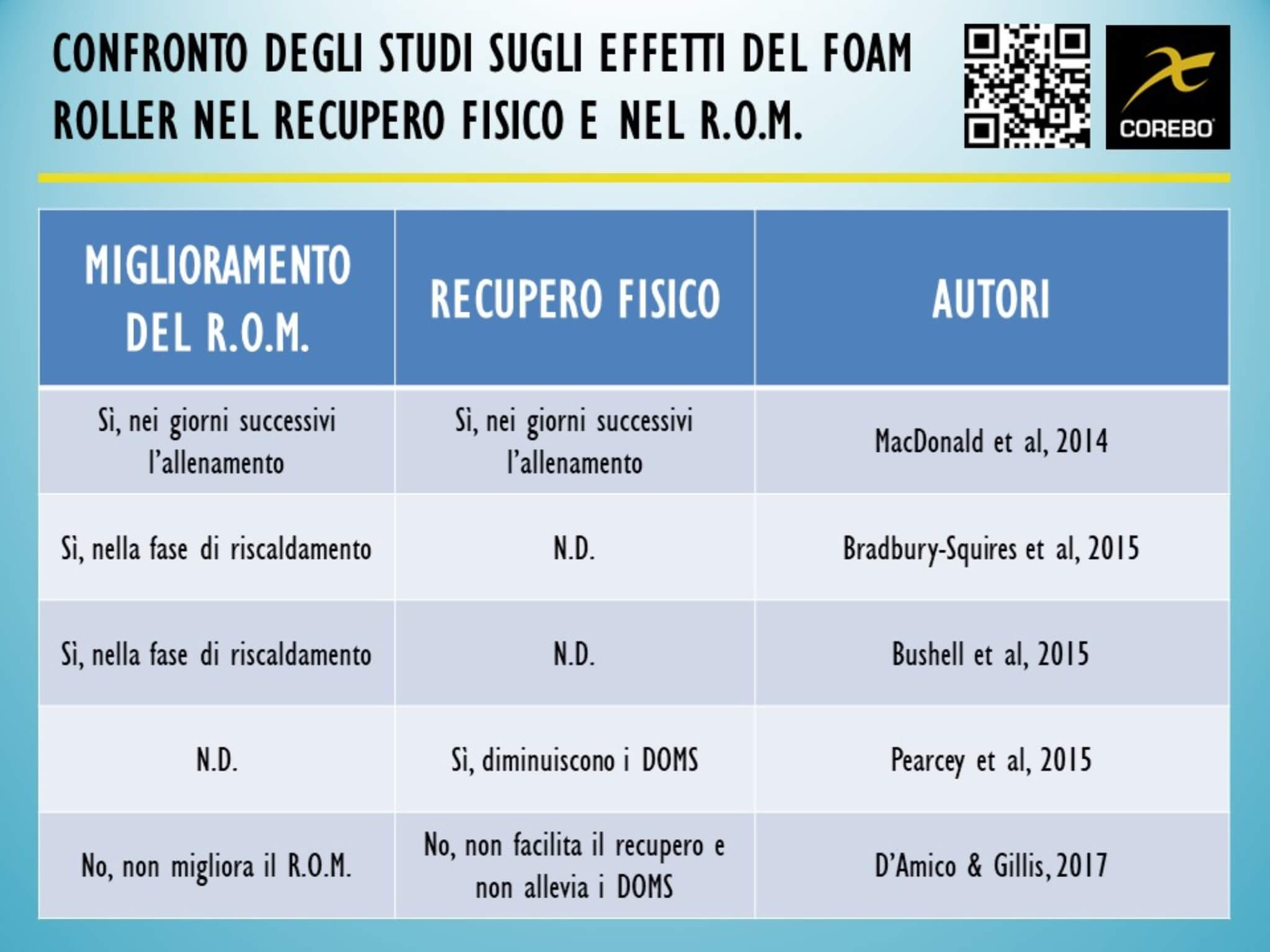- Una recente ricerca mostra che l’utilizzo del Foam Roller non migliora il recupero muscolare, il ROM articolare e nemmeno allevia la sensazione del dolore post allenamento (D’Amico & Gillis, (2017);