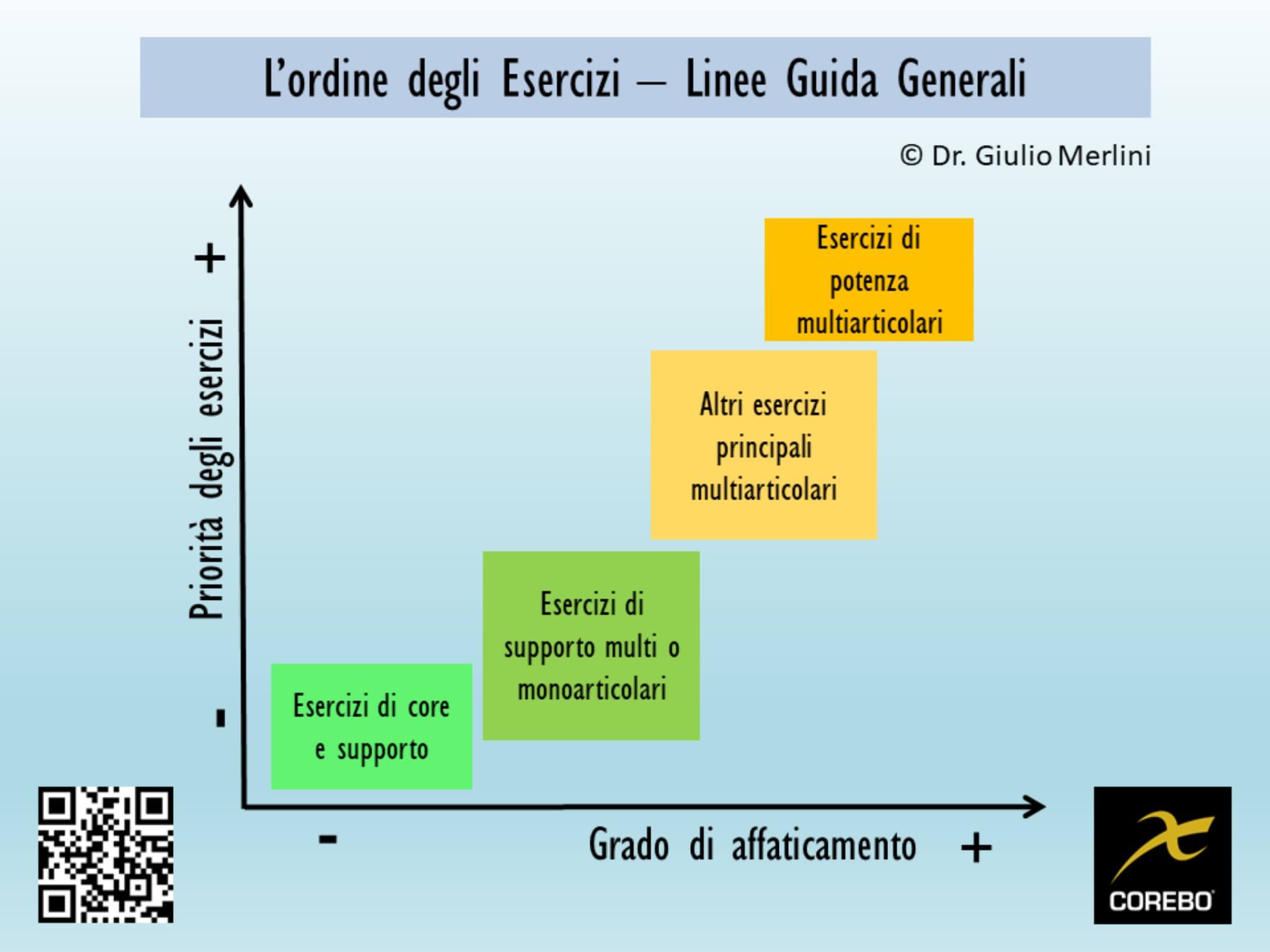 In linea generale, in accordo con quanto affermato dalla National Strength and Conditioning Association, possiamo utilizzare lo schema riportato nella figura sotto in base alla priorità e al livello di difficoltà e affaticamento degli esercizi.