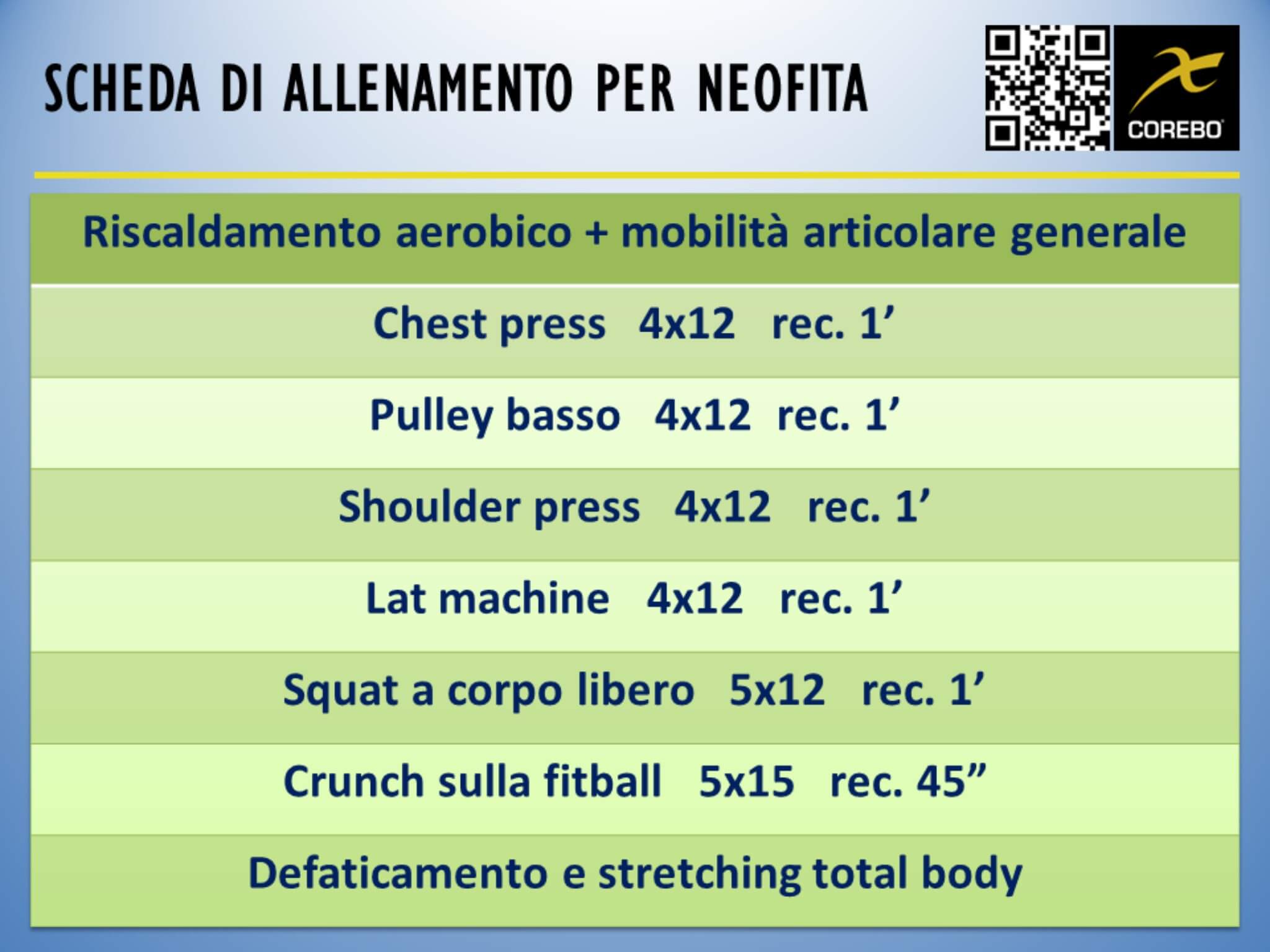 Abbiamo definito dunque come strutturare un programma di allenamento per un soggetto neofita, ora passiamo a stilare la scheda.