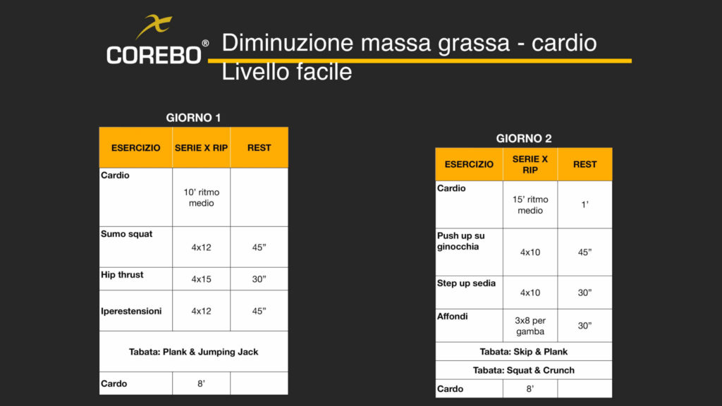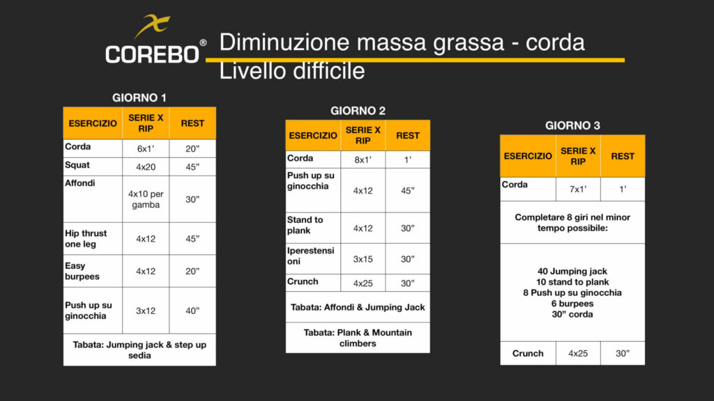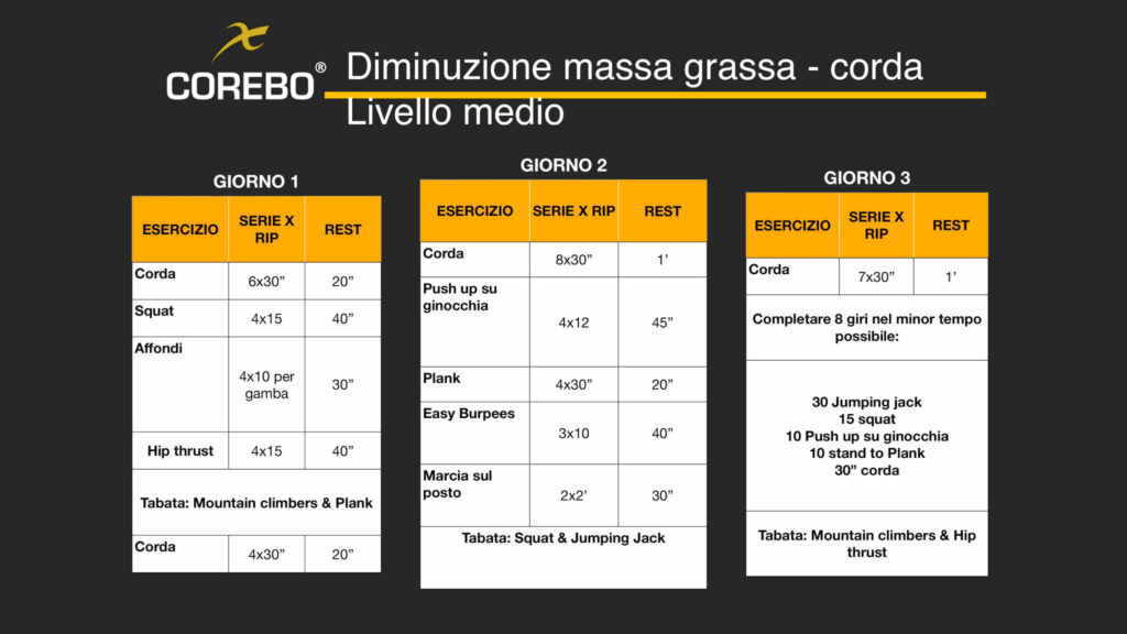 Le schede di allenamento a casa per la perdita di massa grassa saranno sempre divise in 3 livelli: