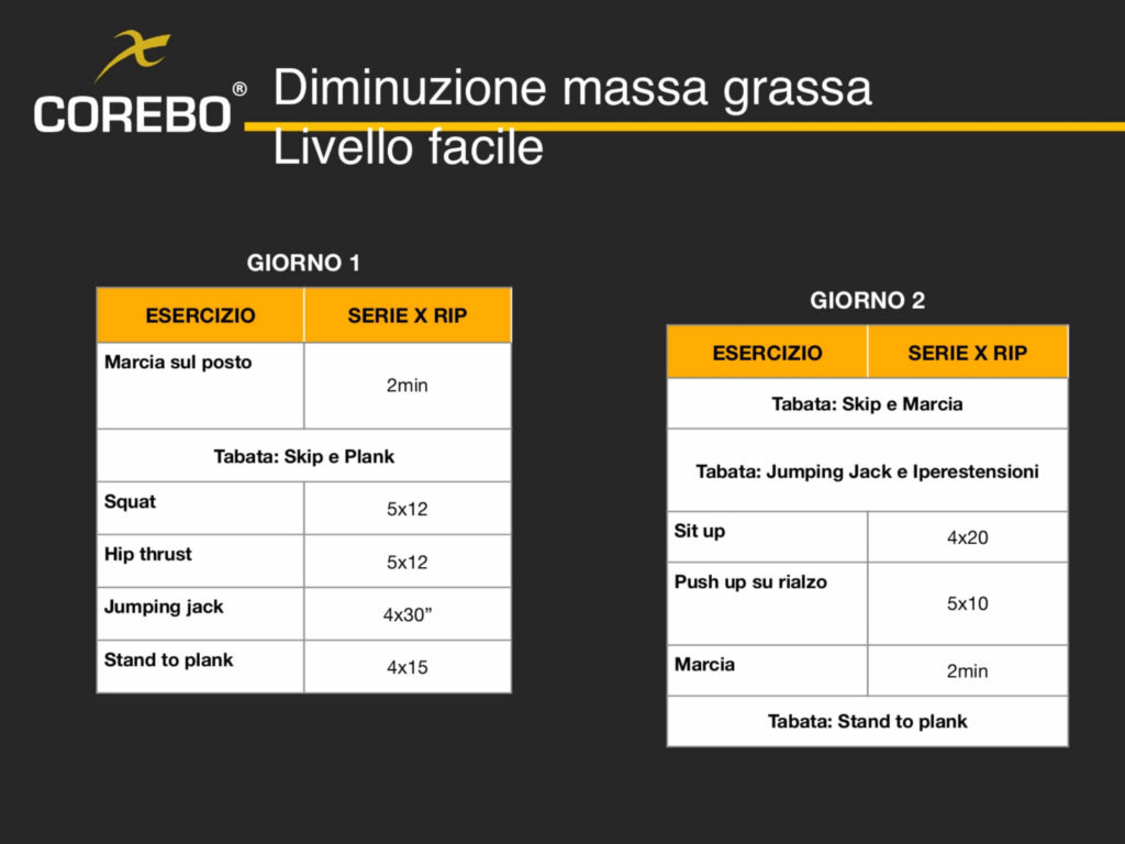 ATTENZIONE: anche le schede di livello “facile” fanno riferimento a persone che si sono allenate e si allenano da diversi mesi. Non improvvisate l’attività fisica e avvaletevi, se siete completamente fuori allenamento, di un trainer qualificato del settore.